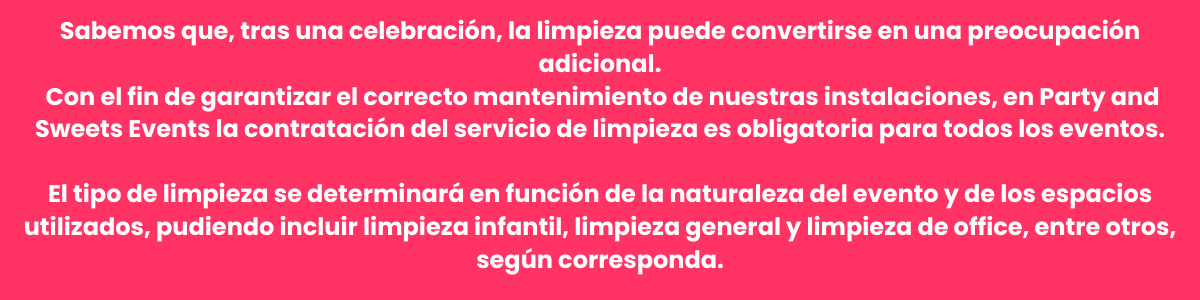 Si se contratan los extras de cocina con planchas y vitrocerámicas así como hornos y freidora será obligatorio añadir el servicio de limpieza de Office + la limpieza mínima obligatoria que corresponda según evento PARTY AND SWEETS pretende ser una extensión del salón de tu casa, por lo que te pedimos que cuides las cosas tal y como lo harías en tu propia casa. De esa manera todo el mundo podrá disfrutarla.